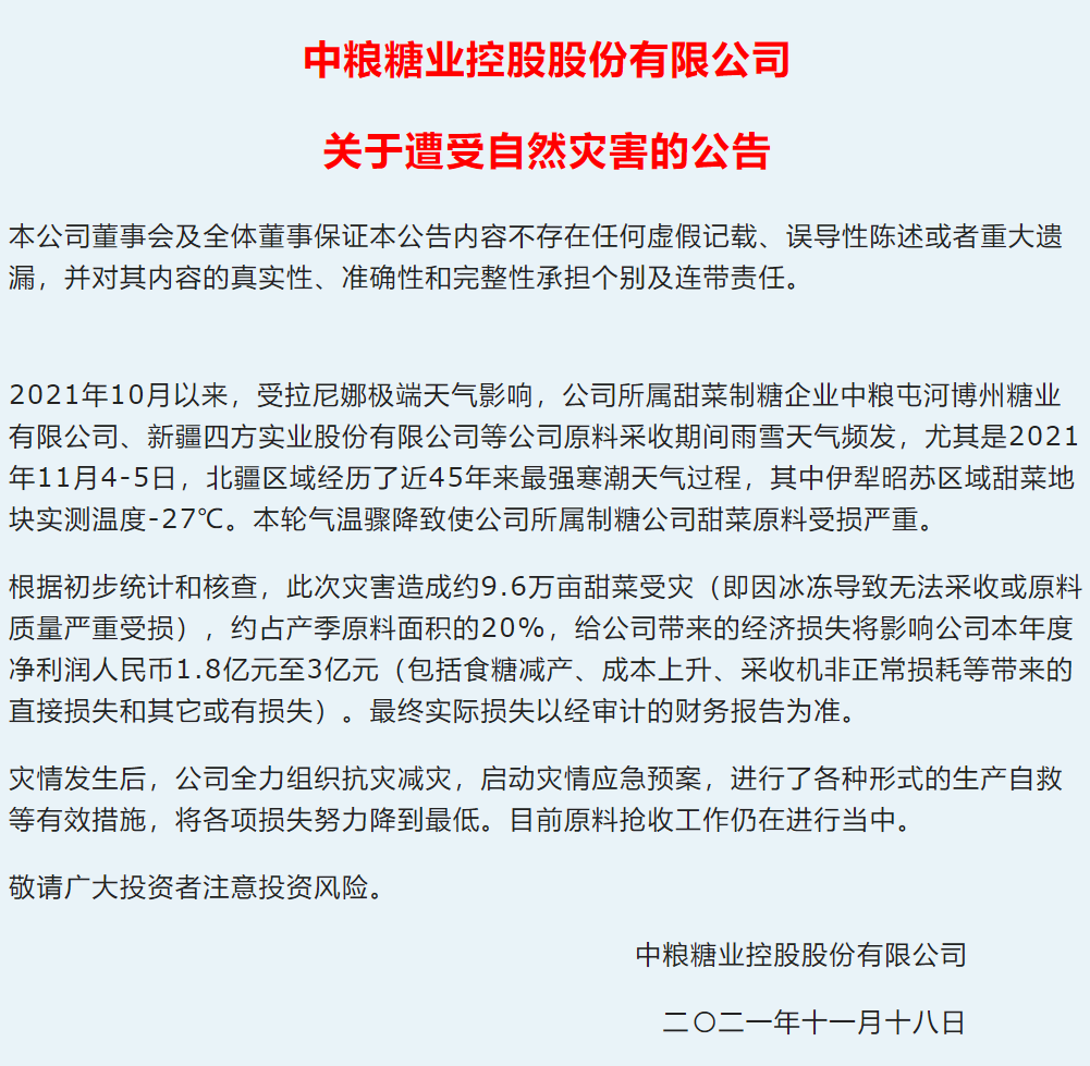 扬子晚报/紫牛新闻记者查询发现,11月18日晚间,中粮糖业控股股份有限公司(简称“中粮糖业”)发布关于遭受自然灾害的公告。