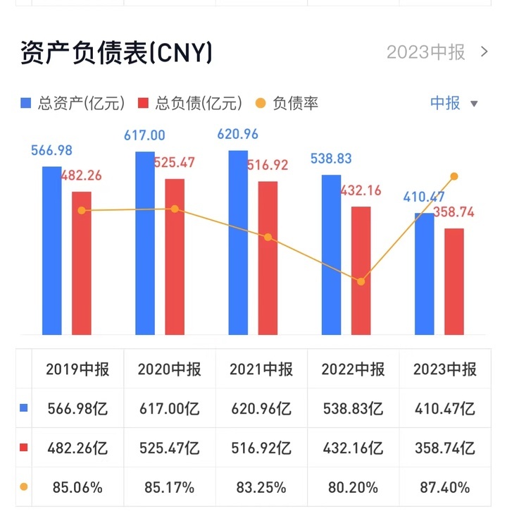 负债率方面,2019年中期至2023年中期,华远地产负债率分别为85.06%、85.17%、83.25%、80.20%、87.40%。其2023上半年负债率创近五年新高。