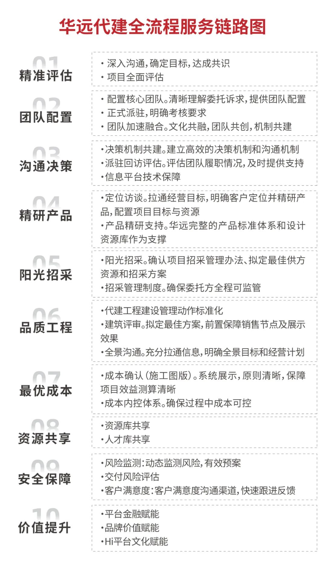 从当初的摸着石头过河到现在的精细化运营管理,华远地产的代建业务已经打磨出一套符合行业生态发展的创新闭环模式,即从营运、产品、成本、工程、服务、权责六大方面,梳理华远代建管理体系的核心价值,在全流程服务链路中建立委托方全程“能参与、可控制、强监督”的管控体系,为委托方提供全面的支持和保障。