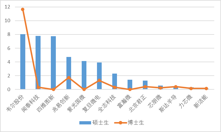 ——人才体系较完善。2021年,“芯片”赛道企业研发人员学历情况如图4所示。数据显示闻泰科技的硕士研究生位居第二,优势明显,但是该赛道的整体水平较低。继2020年底获得“中国年度最佳雇主”奖项后,公司进一步强化雇主品牌,通过由内而外的文化吸引力以及人才培养硬实力,共计招聘、入职2020-2021两届校招人才近1000人。同时,不断升级培训体系,有效建立了覆盖全员、分类明确、层次清晰的阶梯式培训管理体系,并成功打造应届生“星生泰”培养项目,为培养更多德才兼备的卓越人才提供了有力保障。