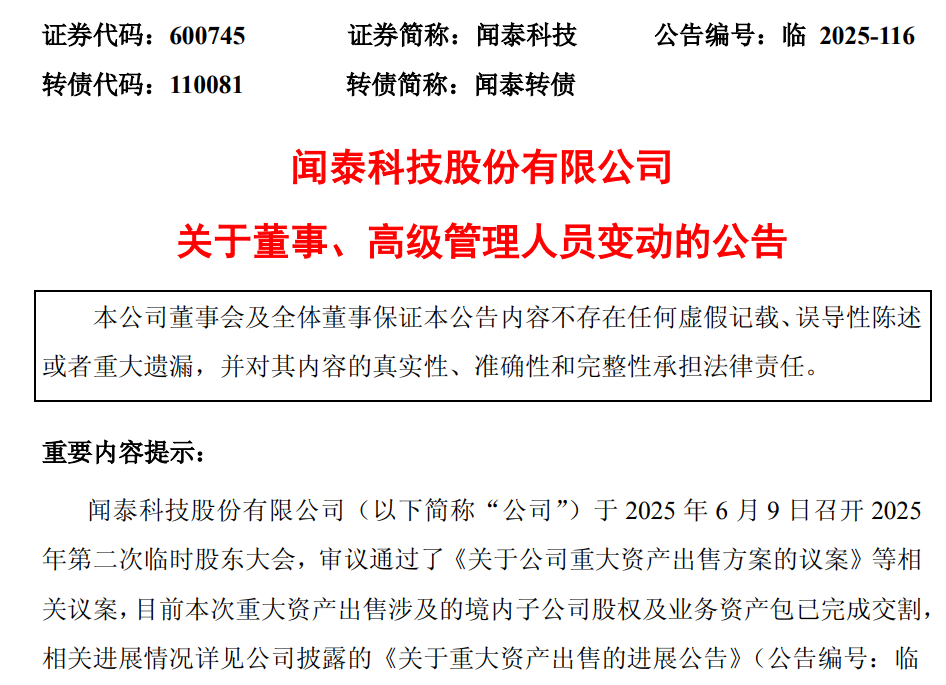 闻泰科技(SH 600745)7月14日晚间发布公告称,公司董事会于近日收到董事长兼总裁张秋红女士、职工代表董事兼副总裁董波涛先生、董事谢国声先生、董事会秘书高雨女士的书面辞任报告,因工作变动原因申请辞去公司董事、高级管理人员相关职务。