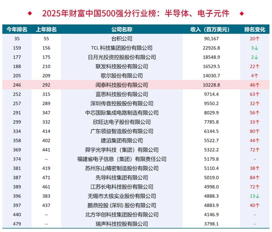近日,2025年《财富》中国500强榜单正式发布,闻泰科技凭借卓越的综合实力位列榜单第246位,较去年提升46位,在半导体与电子元件行业榜中稳居第6名,充分彰显了公司持续增强的核心竞争力。