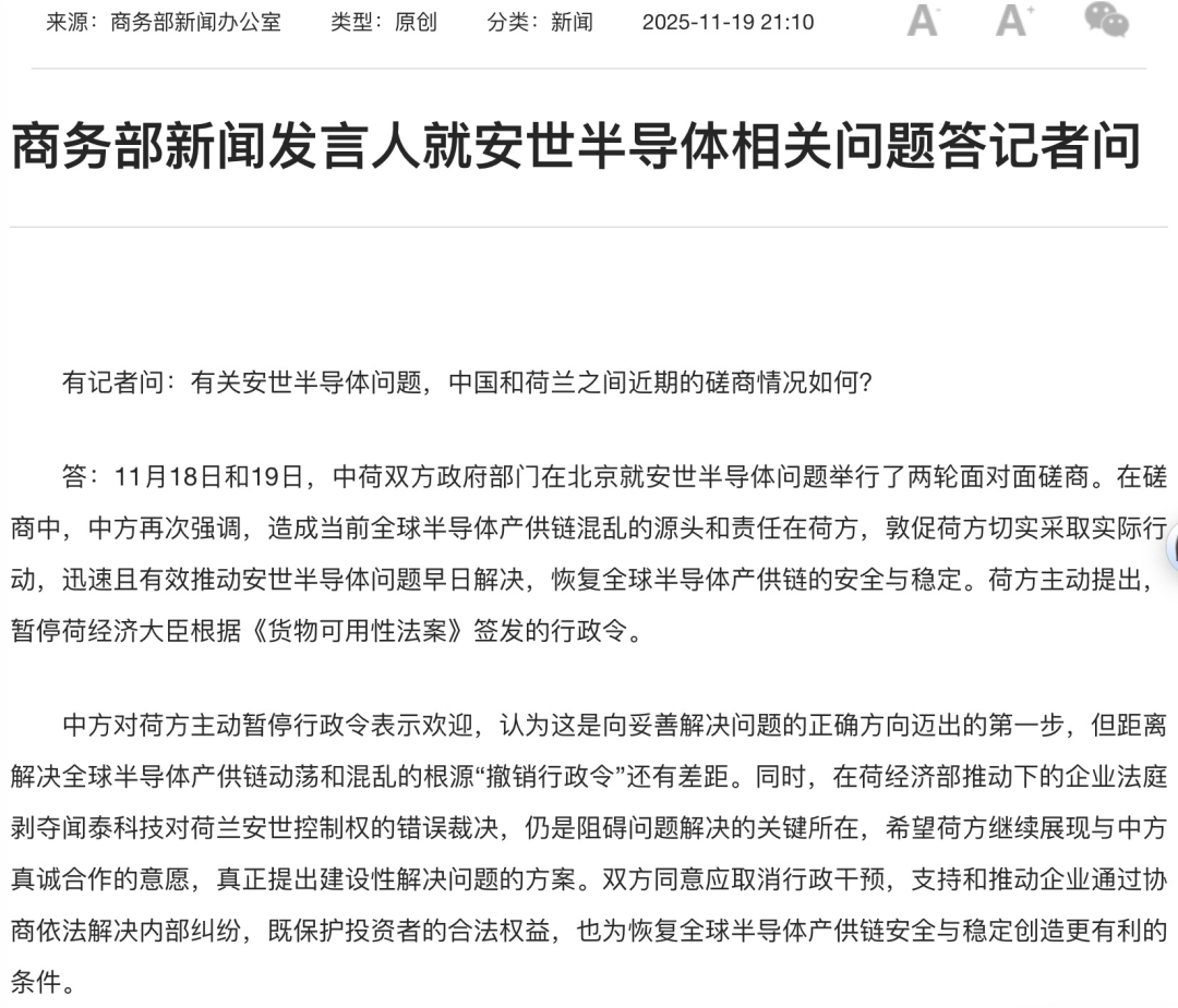 11月19日晚间,商务部在答记者问中披露,11月18日和19日,中荷双方政府部门在北京就安世半导体问题举行了两轮面对面磋商。在磋商中,中方再次强调,造成当前全球半导体产供链混乱的源头和责任在荷方,敦促荷方切实采取实际行动,迅速且有效推动安世半导体问题早日解决,恢复全球半导体产供链的安全与稳定。荷方主动提出,暂停荷经济大臣根据《货物可用性法案》签发的行政令。