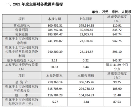 江苏索普(600746.SH)2月23日盘后发布的业绩快报显示,2021年度,公司实现营业总收入80.05亿元,同比增长110.91%;实现归属于上市公司股东的净利润24.12亿元,同比增长942.75%。