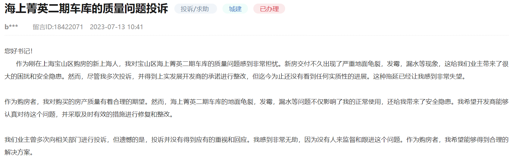 不过值得一提的是,今年7月份,在人民网领导留言板平台,有上实海上菁英二期业主投诉称,新房交付不久,地库就出现了地面龟裂、发霉、漏水等现象,存在安全隐患。而且投诉多次且得到开发商上实发展的承诺进行整改,却未看到实质性的进展,请求相关部门加强监管。