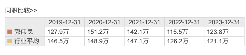 东方财富数据显示,2019年至2023年,郭伟民薪酬分别为127.9万元、151.2万元、142.1万元、115.5万元及123.8万元。