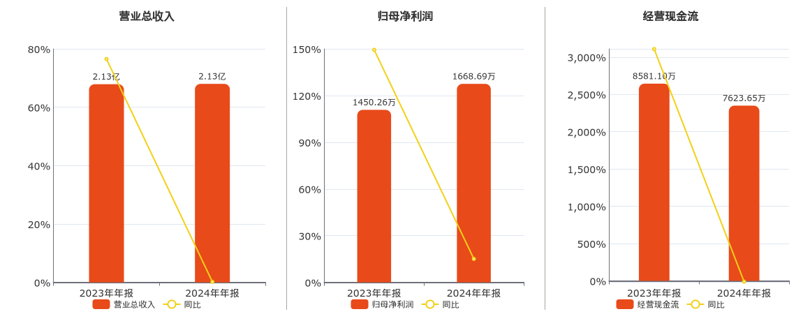 公司营业总收入为2.13亿元。归母净利润为1668.69万元。经营活动现金净流入为7623.65万元,较去年同报告期经营活动现金净流入减少957.45万元,同比较去年同期下降11.16%。