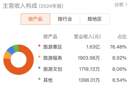 从收入构成来看,西藏旅游目前仍以旅游相关业务作为收入来源。2024年,西藏旅游的旅游景区、旅游服务、旅游文创等业务分别实现营收1.63亿元、1903.98万元、1719.72万元,营收占比分别为76.48%、8.92%、8.06%。