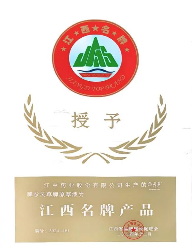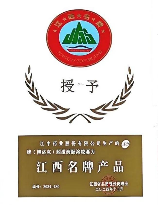 江西省品牌建设促进会打造江西名牌产品旨在深入实施质量强省、工业强省战略,坚持走自主创新、以质取胜的品牌建设道路,提升品牌溢价能力,加快培育形成一批拥有自主知识产权、质量水平高、具有较强国际竞争力的知名品牌,以提升质量推动品牌建设,以品牌建设助推江西省社会经济高质量发展。参灵草牌原草液和江中牌蚓激酶肠溶胶囊(博洛克)、杨济生牌复方鲜竹沥液凭借优质的产品质量、市场高占有率、用户满意度和知名度高,荣获“江西名牌产品”称号。至此,江中药业持有包含江中牌健胃消食片、利活牌乳酸菌素片、江中牌草珊瑚含片、初元牌复合肽营养饮品等11个江西名牌产品。