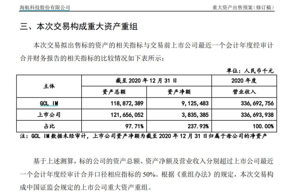 值得注意的是,据当时披露的财务数据,2020年GCL IM所实现的营业收入,占上市公司营收比重为100%;截至2020年末,GCL IM资产总额占上市公司资产总额的比重为97.71%,资产净额占比达237.93%。