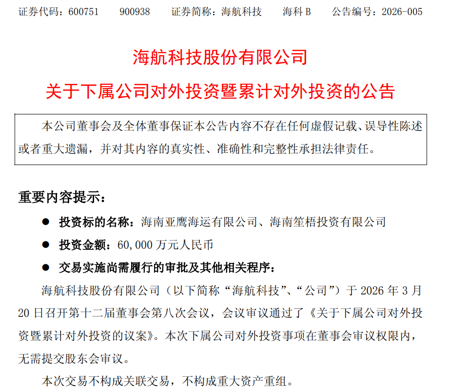 近日,海航科技股份有限公司(证券代码:600751、900938,证券简称:海航科技)发布公告称,为夯实主业基础、提升市场竞争力并全面改善经营业绩,公司于当日召开第十二届董事会第八次会议,审议通过《关于下属公司对外投资暨累计对外投资的议案》。