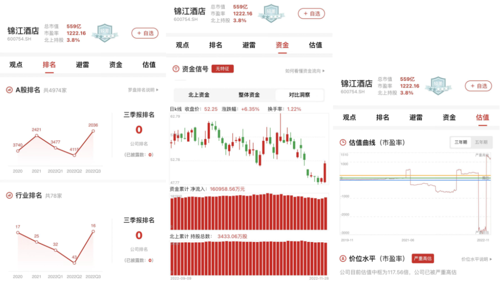 截至2022Q3,锦江酒店在A股的整体排名上升至第2036位,在社会服务行业中的排名上升至第16位。截止2022年11月28日,北上资金并无特别信号。以近三年市盈率为评价指标看,锦江酒店估值曲线处在严重高估区间。