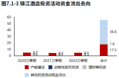 投资流出稳定,主要流向了产能建设。锦江酒店2022三季报的投资活动资金流出,集中在产能建设,占比98.20%。锦江酒店2020年报到本期的投资活动资金流出,其他投资占比最大,占比65.79%。