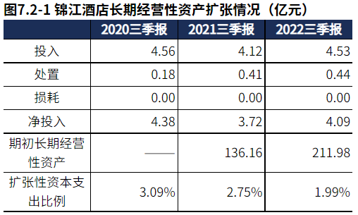 产能稳定。?2022三季报锦江酒店产能投入4.53亿元,处置0.44亿元,折旧摊销损耗0.00元,新增净投入4.09亿元,与期初经营性资产规模相比,扩张性资本支出比例1.99%。