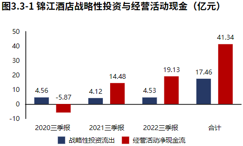 经营活动的造血能力能够覆盖战略投资的资金流出。锦江酒店2022三季报战略投资资金流出4.53亿元,较2021三季报增加0.41亿元,增速9.85%,战略性投资的资金投入有所增长。锦江酒店2020年报到本期战略投资资金流出17.46亿元,经营活动产生现金净流入41.34亿元,经营活动的造血能力能够覆盖战略投资的资金流出。