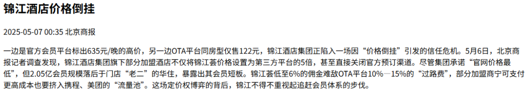 有网友称通过锦江官网预订的房间价格比第三方平台高200多元;有网友称“五一”假期期间通过锦江APP订房,会员价反高于其他平台……