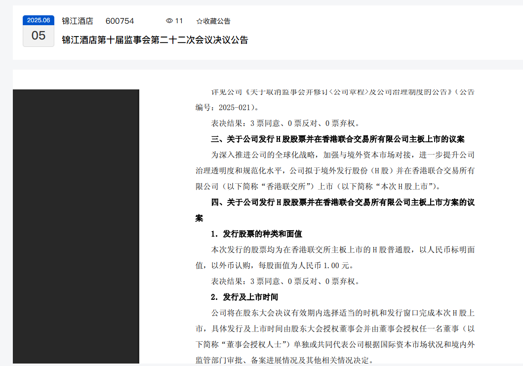 6月5日,锦江酒店发布公告称,为深入推进全球化战略,加强与境外资本市场对接,拟于境外发行股份(H股)并在香港联交所上市。
