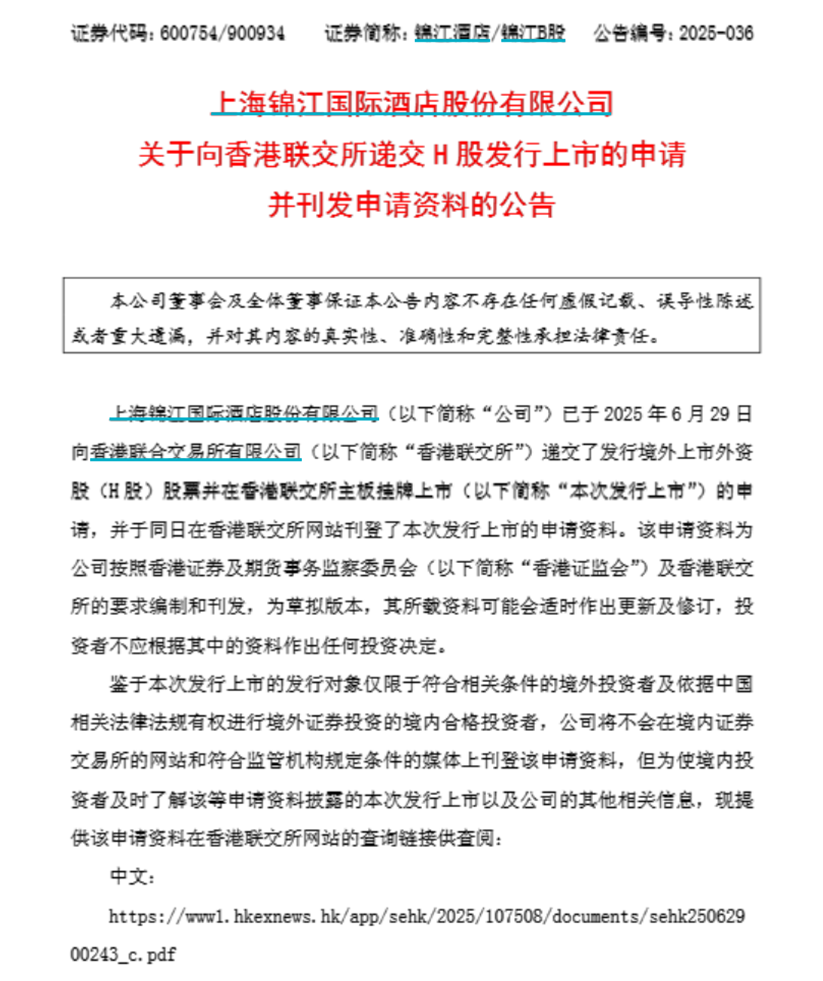 随后在6月30日晚间,锦江酒店发布了关于向香港联交所递交H股发行上市的申请并刊发申请资料的公告。
