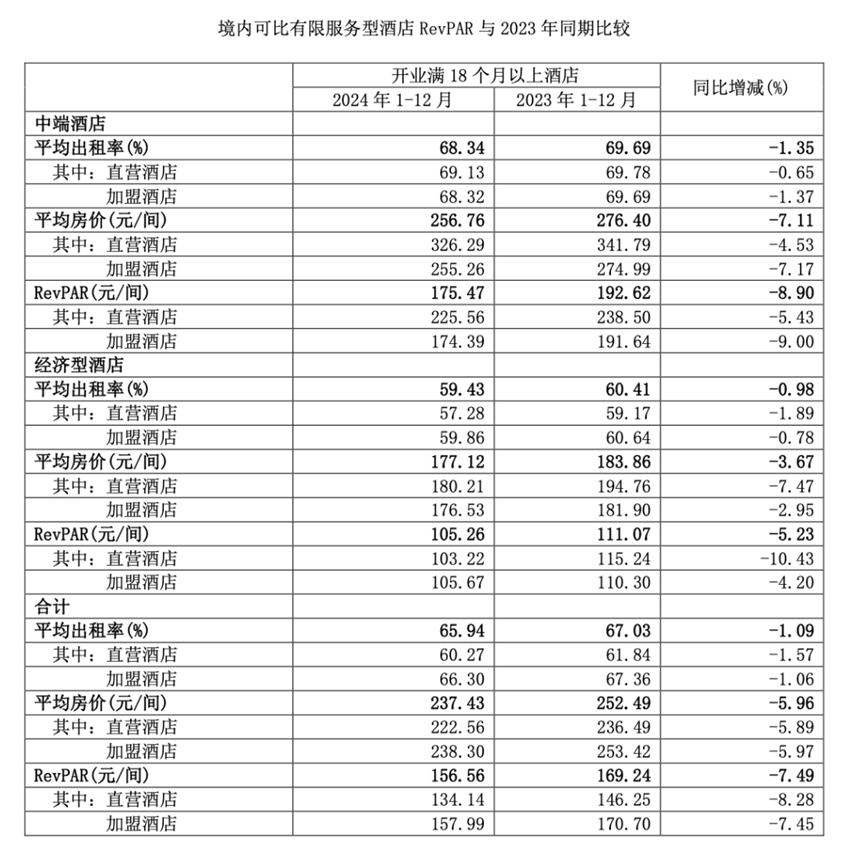 从宏观环境来看,2024年酒店行业普遍面临房价下行压力。酒店之家发布的《2025中国酒店投资白皮书》数据显示,2024年国内酒店整体平均可出租客房收入(RevPAR)同比降幅达9.7%,入住率(OCC)同比下降2.5个百分点,平均房价(ADR)同比下降5.8%,房价下滑已成为行业常态。在行业整体深陷“量价齐跌”的情况下,锦江酒店也很难例外。