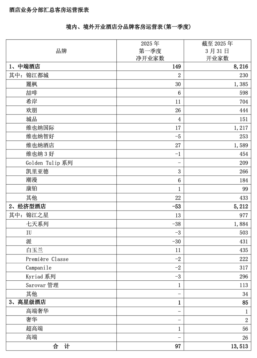 数据显示,2024年该酒店集团净新增开业酒店达968家;而进入2025年一季度,扩张节奏有所放缓,净新开酒店97家,整体门店总数增至13513家。