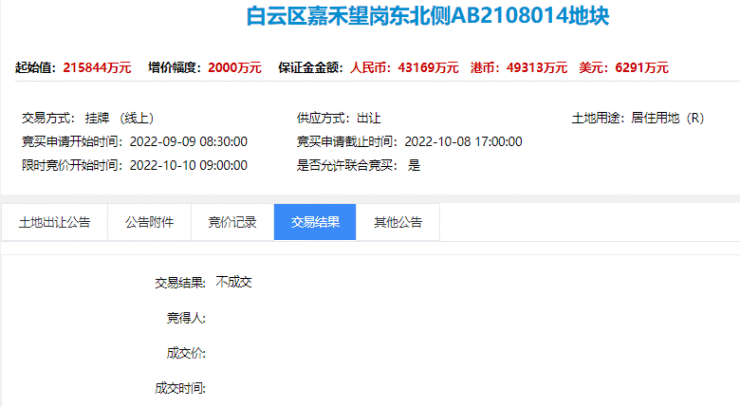 经过现场摇号,白云区嘉禾望岗东北侧AB2108014地块最终为厦门国贸拿下。地块成交总价248220万元,折合楼面价24650元/㎡。