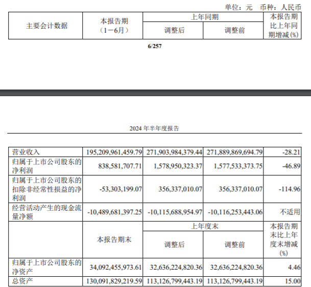 2024年上半年,厦门国贸实现营业收入1952.10亿元,同比下降28.21%;归属于上市公司股东的净利润8.39亿元(同比下降46.89%),剔除上年同期转让国贸期货控制权和类金融子公司股权的利润影响,归属于上市公司股东的净利润同比下降35.36%。经营活动产生的现金流量净额为-104.9亿元。