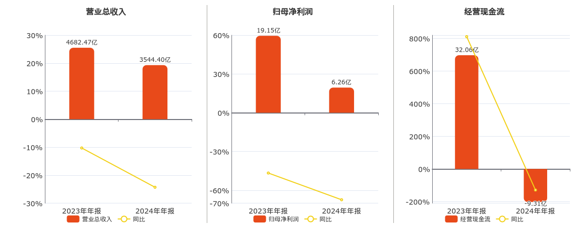 公司营业总收入为3544.40亿元,较去年同报告期营业总收入减少1138.07亿元,同比较去年同期下降24.30%。归母净利润为6.26亿元,较去年同报告期归母净利润减少12.89亿元,同比较去年同期下降67.33%。经营活动现金净流入为-9.31亿元,较去年同报告期经营活动现金净流入减少41.37亿元,同比较去年同期下降129.06%。