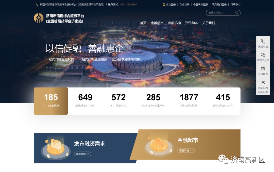 根据国家最新政策要求、考核指标,聚合数据、技术、政策、运营等关键要素,打造济南市融资信用服务平台,面向政府、金融机构、运行机构、企业等多类型用户,提供融资需求发布、企业信用信息查询、融资订单受理、融资监管等全方位服务,目前已发放助企纾困贷款突破415亿元,其建设推广经验入选国家发展改革委《优化营商环境百问百答》。