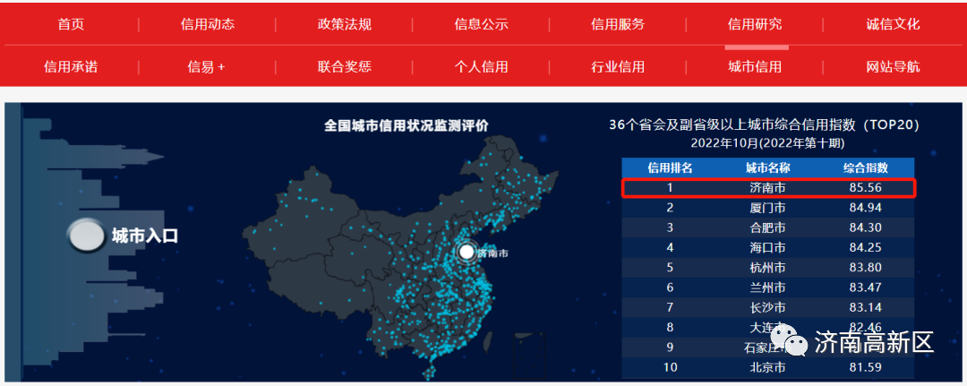 近日,信用中国网站发布的最新一期城市综合信用监测排名(2022年第十期)显示,济南市综合信用指数为85.56,在36个省会及副省级以上城市中排名第1位,创山东省和济南市历史最好成绩。今年以来,济南市信用监测排名已三次位居全国前五。