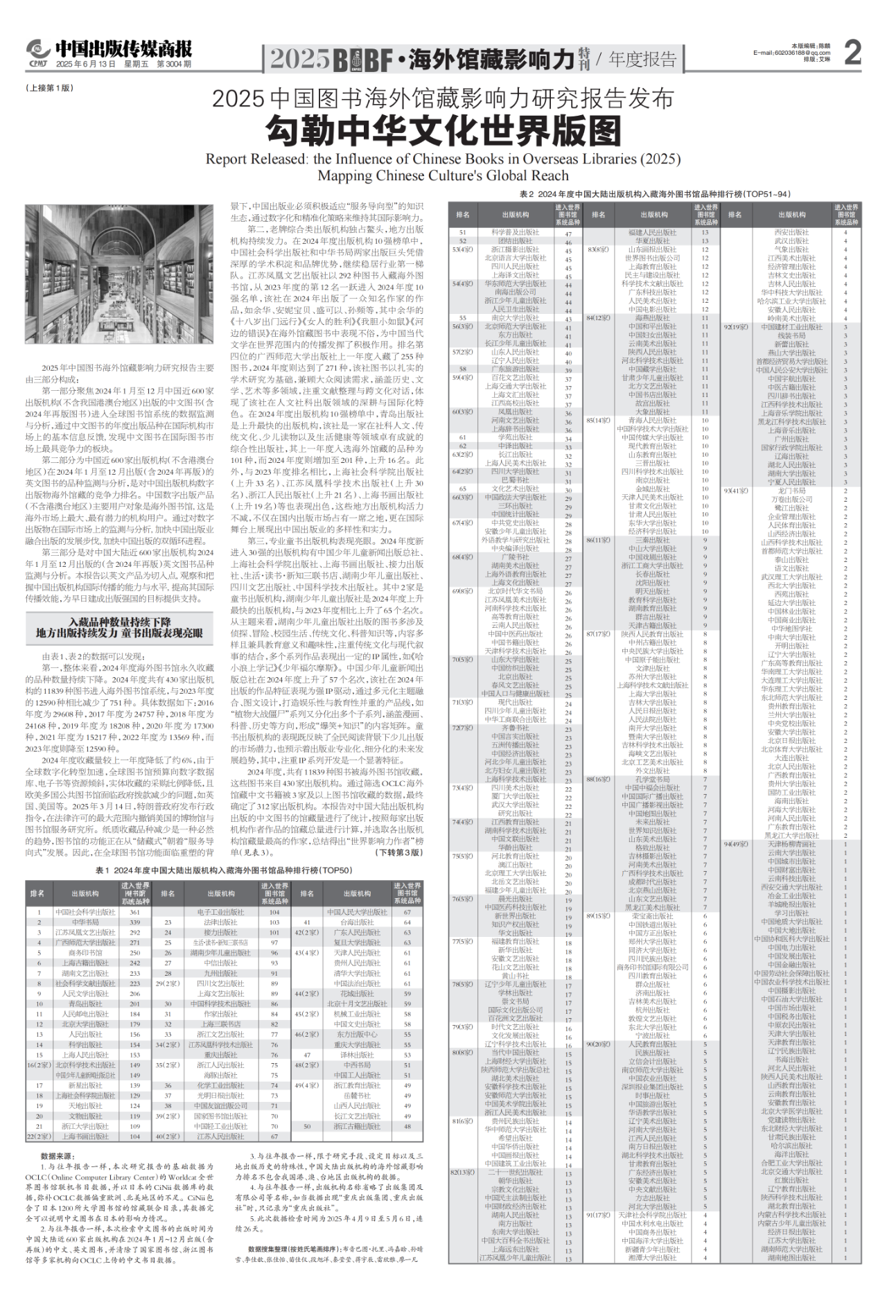 中国图书海外馆藏影响力报告是基于第三方客观数据的年度评估研究,系统收集海外学界和图书馆对中国大陆出版物的反馈数据,由中国出版传媒商报社、北京外国语大学国际新闻与传播学院中国文化走出去效果评估中心共同发布。其发布的海外馆藏数据已经成为目前中国出版界衡量世界影响、检验图书“走出去”效果的一个最重要的客观指标。今年是中国图书海外馆藏影响力年度研究报告发布的第14年,2024年度共有430家出版机构的11839种图书进入海外图书馆系统。长江文艺出版社连续14年跻身“100强”,长江少年儿童出版社连续10年跻身“100强”。