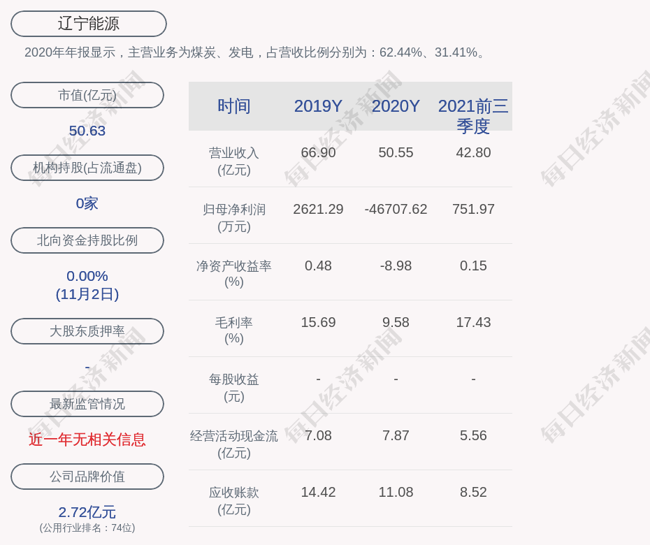 2020年年报显示,辽宁能源的主营业务为煤炭、发电,占营收比例分别为:62.44%、31.41%。