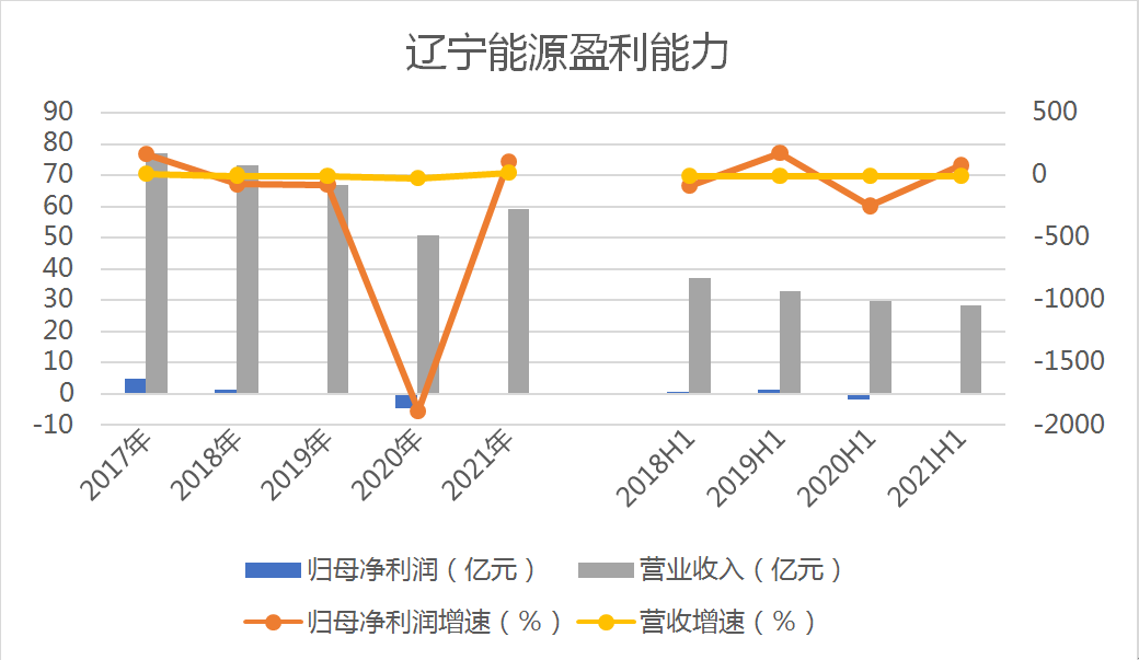 从半年报来看,2018年至2021年上半年,辽宁能源的归母净利润分别为0.47亿元、1.31亿元、-1.94亿元、-0.53亿元,2021年上半年公司归母净利润较2020年同期相比有所上升但仍为负值。归母净利润增速分别为-89.50%、172.72%、-247.77%、72.69%,2021年上半年公司归母净利润增速较2020年同期相比有所上升,归母净利润增速由负转正。营业收入分别为36.95亿元、32.93亿元、29.78亿元、28.17亿元,2021年上半年公司营业收入较2020年同期相比有所下降,营收增速分别为-7.73%、-10.88%、-9.57%、-5.40%,2021年上半年公司营收增速较2020年同期相比有所上升但仍为负增长。
