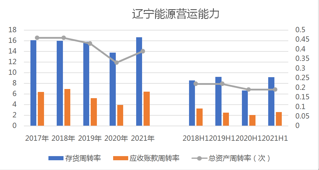 从半年报来看,2018年至2021年上半年,辽宁能源的存货周转率分别为8.57、9.24、6.69、9.14,2021年上半年公司存货周转率较2020年同期相比有所上升。应收账款周转率分别为3.27、2.48、2.05、2.61,2021年上半年公司应收账款周转率较2020年同期相比有所上升。总资产周转率分别为0.22次、0.22次、0.19次、0.19次,2021年上半年总资产周转率较2020年同期相比持平。