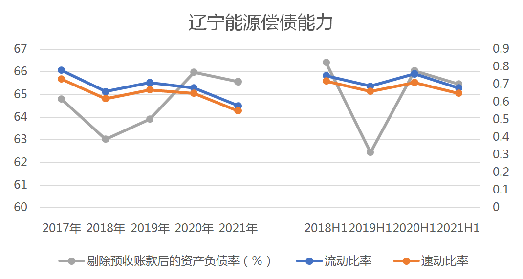 从半年报来看,2018年至2021年上半年,辽宁能源的流动比率分别为0.75、0.69、0.76、0.68,2021年上半年公司流动比率较2020年同期相比有所下降。速动比率分别为0.72、0.66、0.71、0.65,2021年上半年公司速动比率较2020年同期相比有所下降。剔除预收账款后的资产负债率分别为66.42%、62.45%、66.05%、65.47%,2021年上半年公司剔除预收账款后的资产负债率较2020年同期相比有所下降。