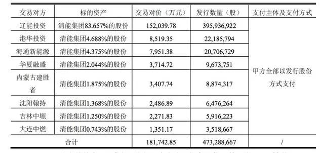 3月5日,辽宁能源(600758)公告发行股份购买资产并募集配套资金暨关联交易报告书(草案)。报告书显示,拟以发行股份的方式购买辽能投资、港华投资、海通新能源、华夏融盛、内蒙古建胜者、沈阳翰持、吉林中塬、大连中燃共8名投资者持有的清能集团 100%股份,标的资产的交易作价合计181,742.85万元,对应发行股份数量合计473,288,667股。
