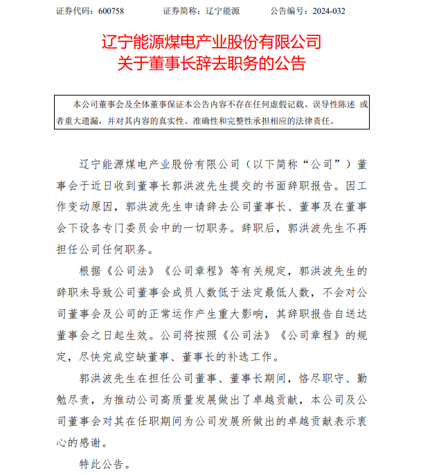辽宁能源12月11日晚间公告,因工作变动原因,郭洪波申请辞去公司董事长、董事及在董事会下设各专门委员会中的一切职务。辞职后,郭洪波不再担任公司任何职务。