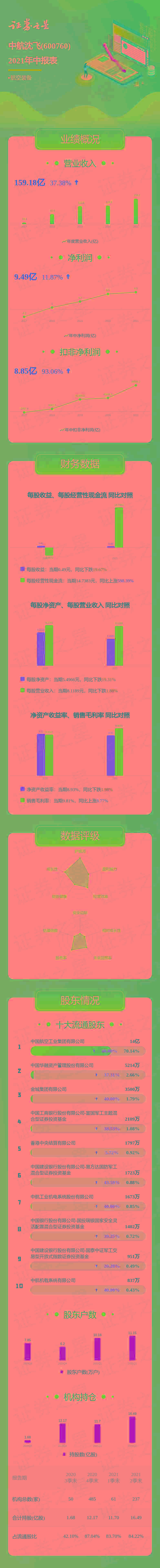 中航沈飞(600760)2021中报显示,公司主营收入159.18亿元,同比上升37.38%;归母净利润9.49亿元,同比上升11.87%;扣非净利润8.85亿元,同比上升93.06%;负债率82.59%,投资收益-341.88万元,财务费用-8983.59万元,毛利率9.81%。
