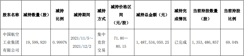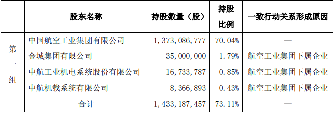 截至本次减持计划披露日,航空工业集团及其一致行动人合计持有公司股份14.33亿股,占公司总股本73.11%。其中,航空工业集团直接持有公司股份13.73亿股,占公司总股本70.04%。