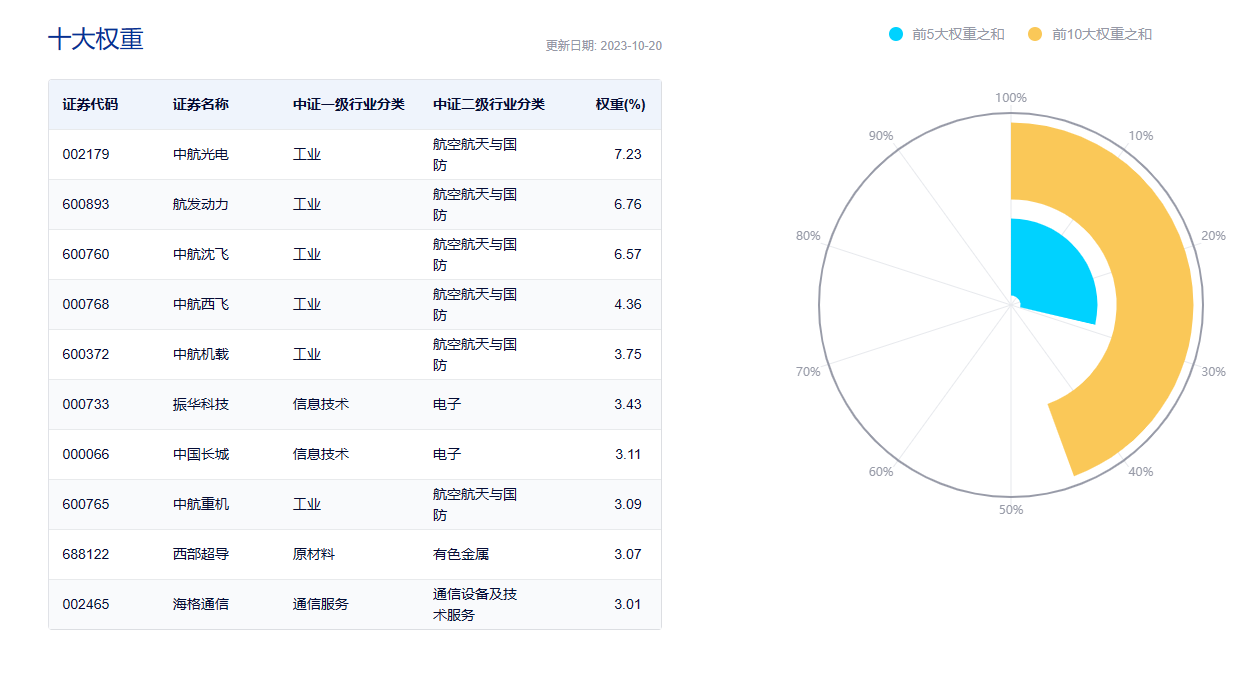 高端装备ETF(159638)跟踪中证高端装备细分50指数,该指数从沪深市场中选取50只涉及航空航天装备制造、航空动力及控制系统、微波雷达、卫星导航、光电红外、通信设备、电子元器件、信息安全、航空航天材料等业务的代表性上市公司证券作为指数样本,以反映航空航天等高端装备细分领域上市公司证券的整体表现;指数前十大权重股包括中航光电、中航沈飞、中航西飞等,其权重合计占比超40%。(资料来源:中证指数官网,截至2023.10.20)