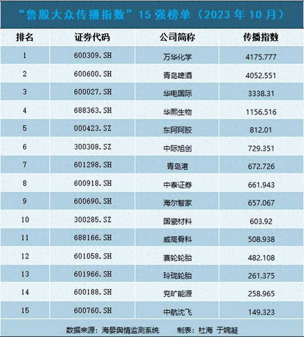 “鲁股大众传播指数”(2023年10月)15强榜单如期而至。该指数由《经济导报》社与山东省互联网传媒集团联合发布,呈现“热搜上的山东上市公司”,助力山东资本市场高质量发展。