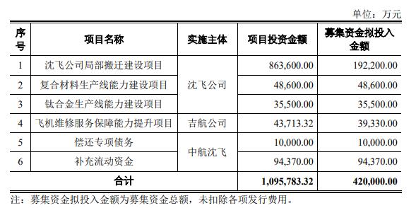 2024年12月6日,中航沈飞发布的2023年度向特定对象发行A股股票募集说明书(申报稿)显示,本次向特定对象发行募集资金总额不超过420,000.00万元(含本数),在扣除相关发行费用后的募集资金净额将投资于如下项目:沈飞公司局部搬迁建设项目、复合材料生产线能力建设项目、钛合金生产线能力建设项目、飞机维修服务保障能力提升项目、偿还专项债务、补充流动资金。