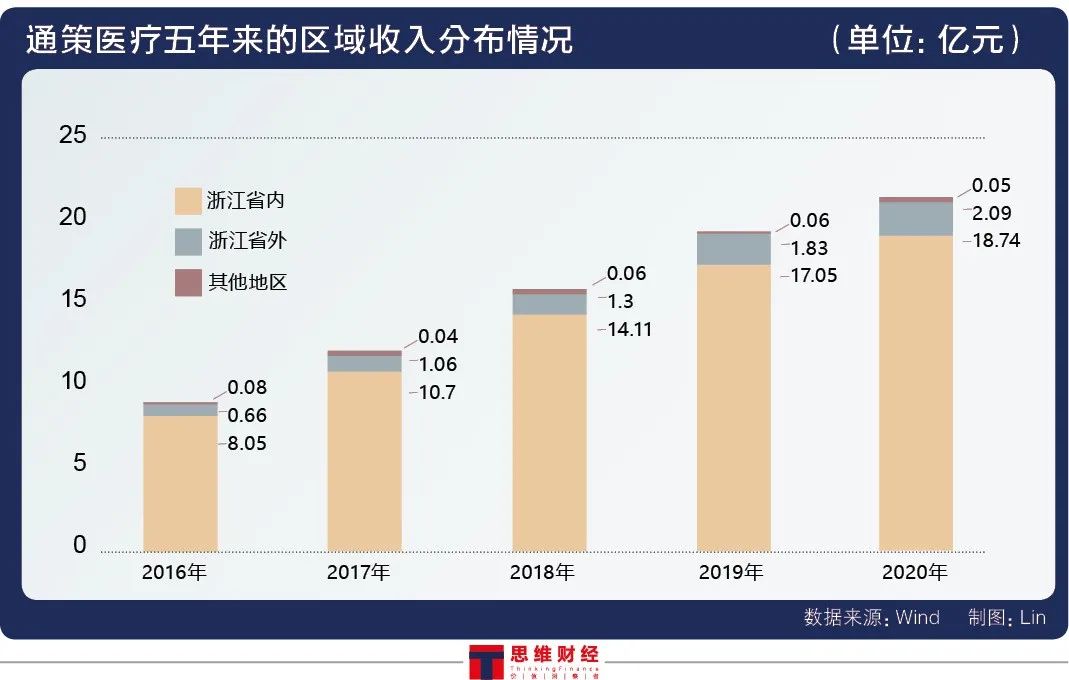 此外引人注意的是,这些年通策医疗一直难走出浙江省。根据公司这些年的区域收入分部情况可见,2016年至2020年期间,浙江省内的营业收入分别为8.05亿元、10.7亿元、14.1亿元、17元和18.7亿元;而浙江省外的营业收入则仅为0.66亿元、1亿元、1.3亿元、1.8亿元和2亿元。相较于此,其他地区的营业收入“不值一提”。