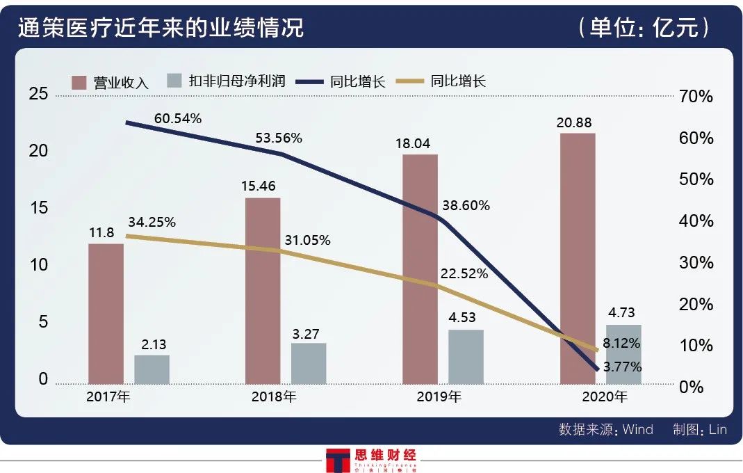近些年通策医疗业绩虽在增长,但增幅明显收窄。2017年至2020年,公司营业收入分别为12亿元、15亿元、19亿元和21亿元,同比增长34%、31%、22%和8%;扣非归母净利润分别为2亿元、3亿元、4.5亿元和4.7亿元,同比增长61%、54%、39%和3.7%。
