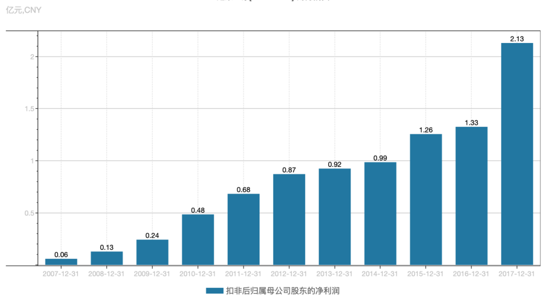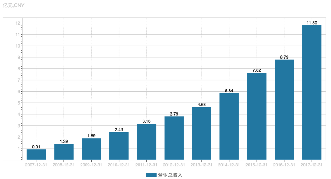 数据显示,2010年至2017年,通策医疗每年的营收和净利实现了稳步增长,从2010年2.53亿营收规模,至2017年11.8亿营收规模,几乎每年以20%左右的速率匀速递增,2017年年报更是同比增长35%。