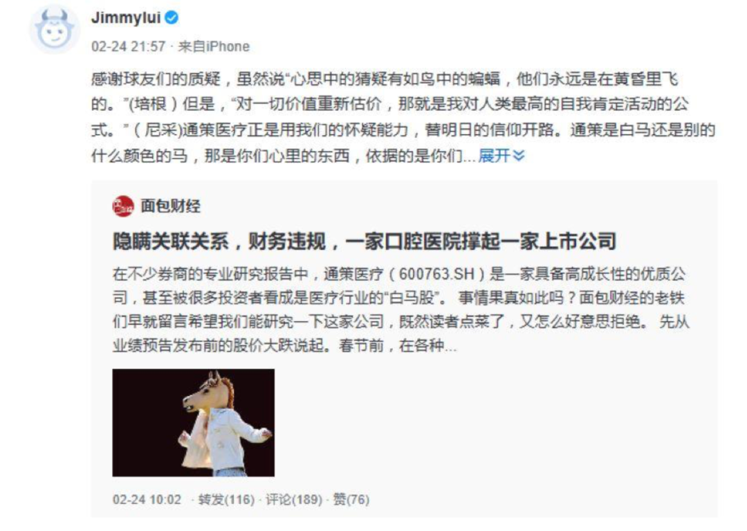 2018年2月,有财经自媒体发文质疑通策医疗是“伪白马”,随即吕建明用一篇近3000字的长文给出回应。