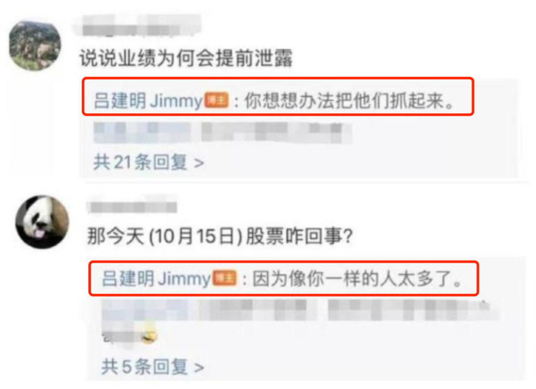 有投资者问及14日公司股价为何跌停,吕建明回应称:“问你,我怎么知道?”“(股价大跌)因为像你一样的人太多了”。对于业绩提前泄露的质疑,吕建明则表示:“我们这么好的成绩,泄露了涨停才对!”“你想想办法把他们抓起来。”