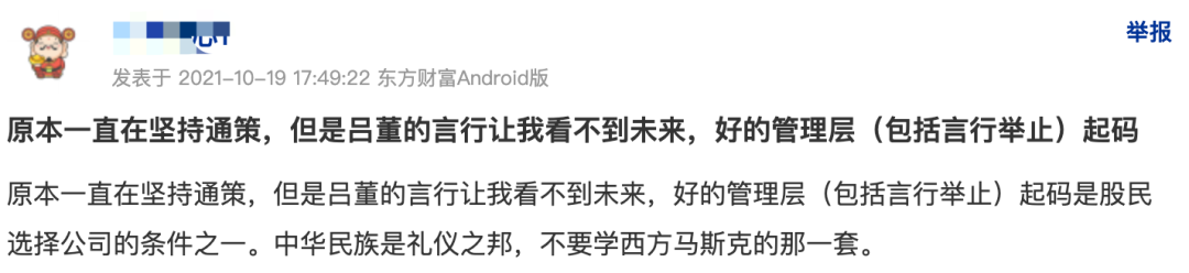 凤凰网《风暴眼》发现,吕建明一直以来就有公开谈论公司的习惯,并且态度鲜明——力挺公司的一切,并反对任何质疑。