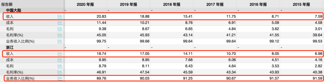 纵观公司2015年以来的收入分布可以发现,浙江省内贡献了最大的营收与利润,连续多年来业务收入比例在90%以上。