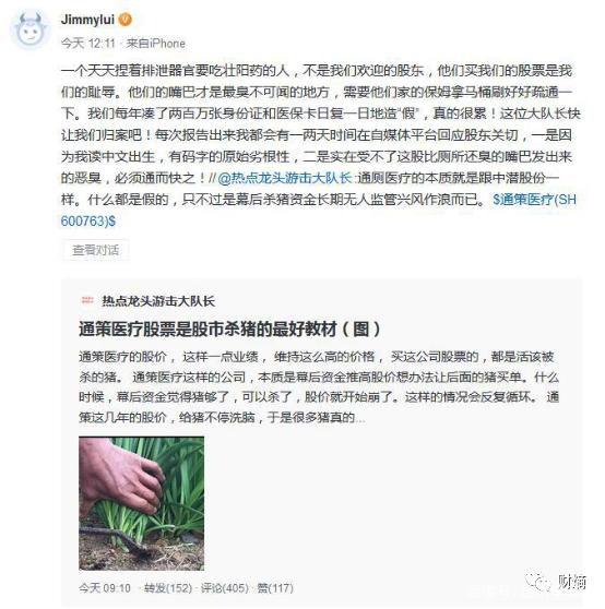 相比在微博上的调侃式回应,10月17日吕建明在雪球上的回复则显得火药味十足。面对网友将通策医疗称为“通厕医疗”、“杀猪盘”的说法,吕建明公开回击“他们买我们的股票是我们的耻辱”。