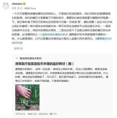 近期,关于通策医疗最热烈的讨论不是连续的跌停,而是其董事长吕建明与股民“互怼”一幕。从15日起,在雪球平台上,吕建明多次措辞粗鲁回应股民关切:在转发一篇题为《通策医疗股票是股市杀猪的最好教材》的文章时破口大骂“这样的人买我们的股票是我们的耻辱”、“实在受不了这股比厕所还臭的嘴巴发出来的恶臭,必须通而快之!”